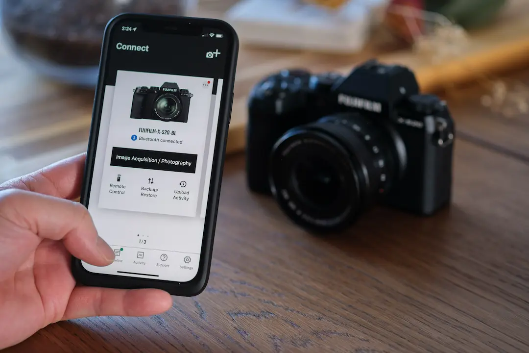 “FUJIFILM XApp” es la nueva aplicación diseñada específicamente para que las cámaras de la serie FUJIFILM X/GFX se comuniquen con su teléfono inteligente/tableta. Le permite transferir imágenes de forma inalámbrica, controlar la cámara de forma remota, mantener un registro de tus actividades fotográficas, guardar y restaurar la configuración de su cámara, mantener tu firmware actualizado y más para respaldar su vida fotográfica.